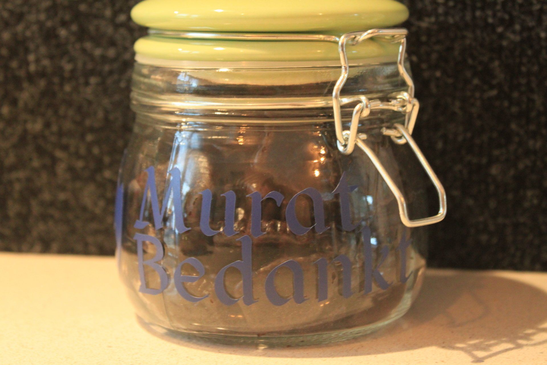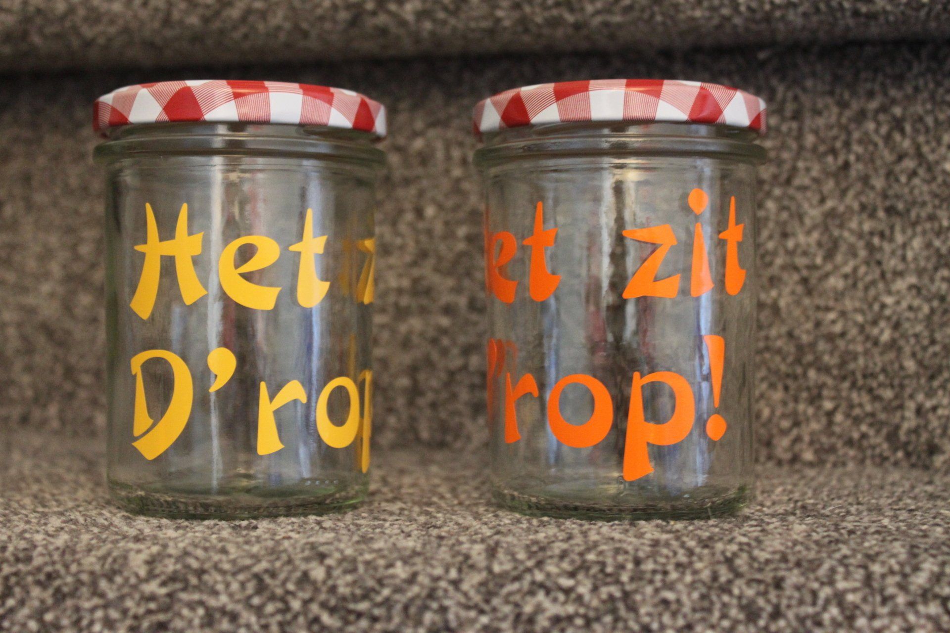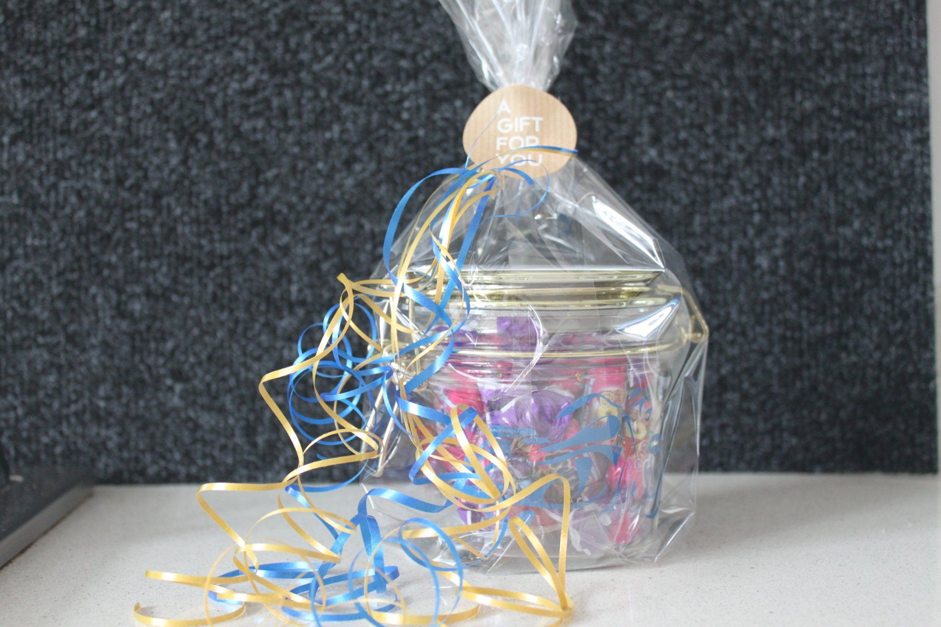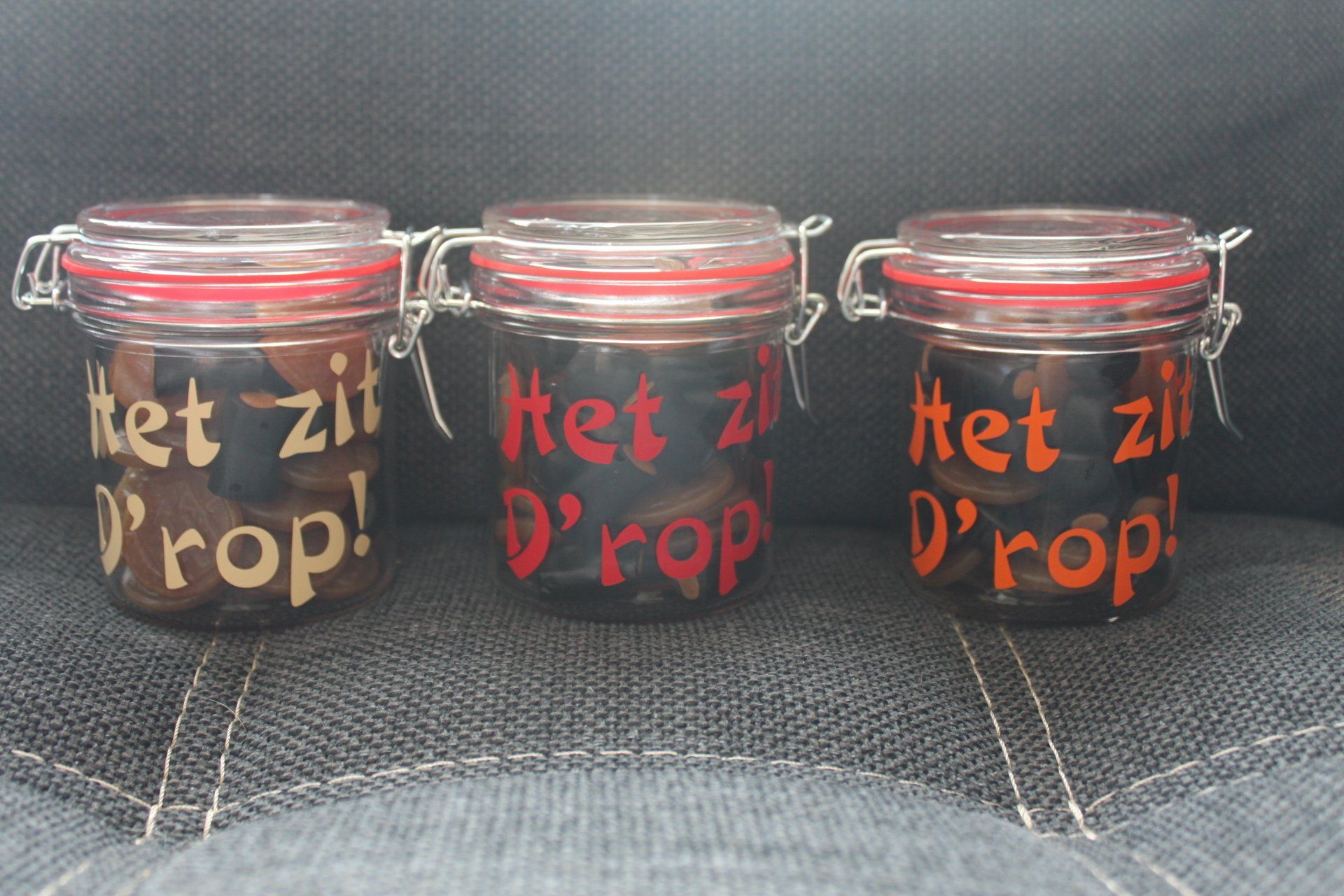 Bestel een snoeppot of wekpot met een leuke decoratie sticker en eventueel met naam of iets dergelijks erop.