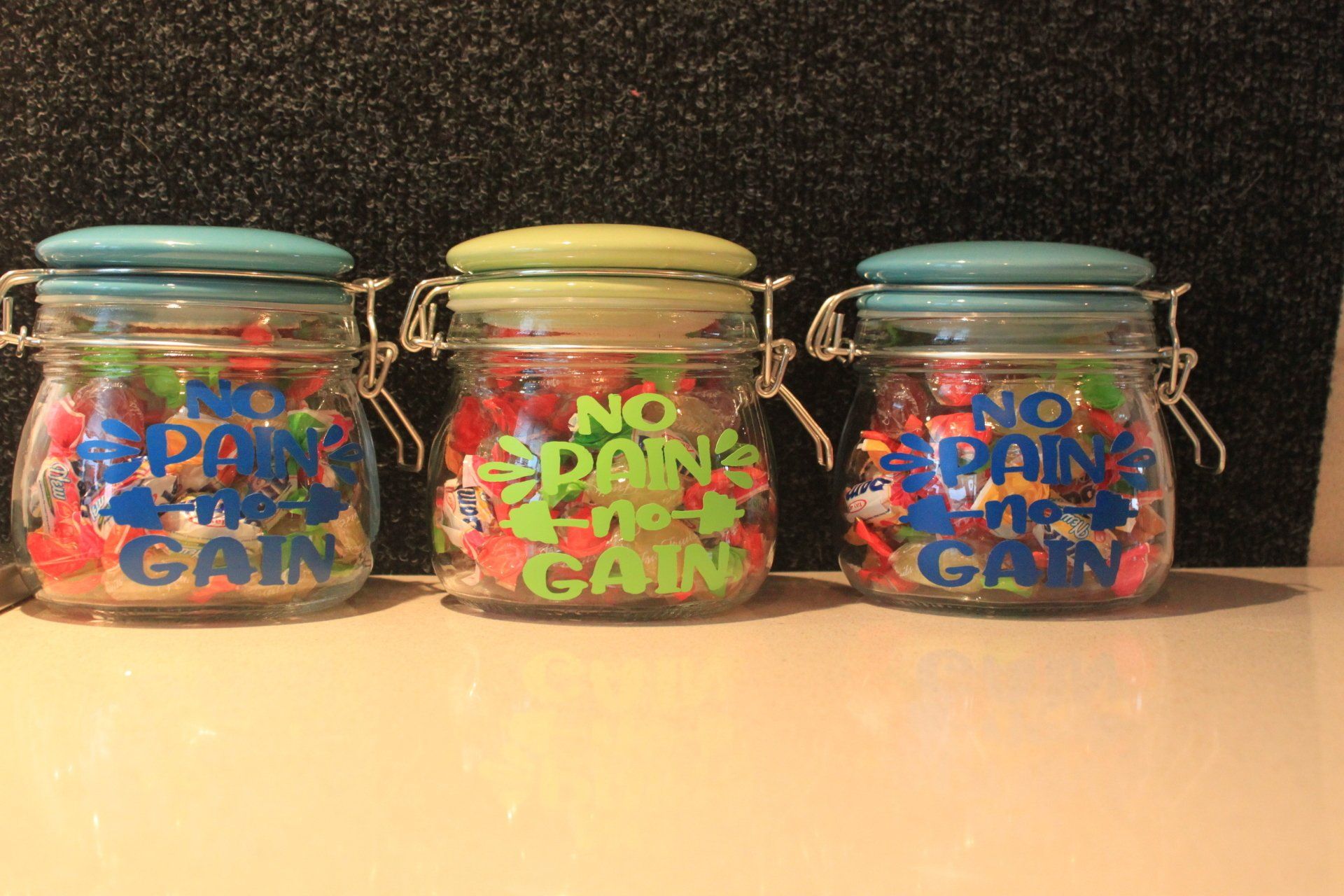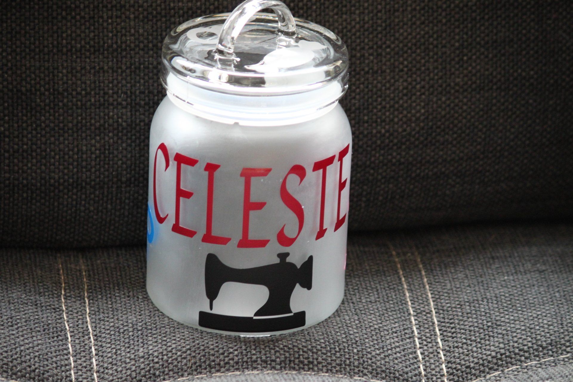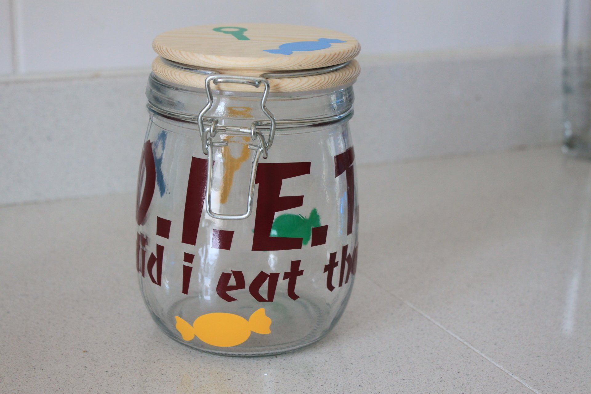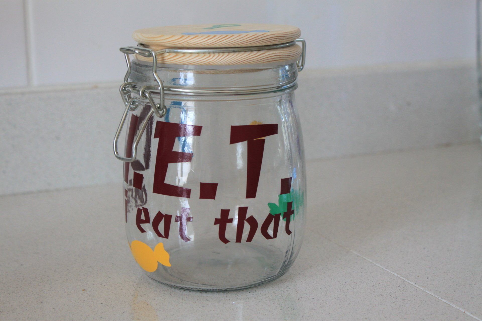 Bestel een snoeppot of wekpot met een leuke decoratie sticker en eventueel met naam of iets dergelijks erop.