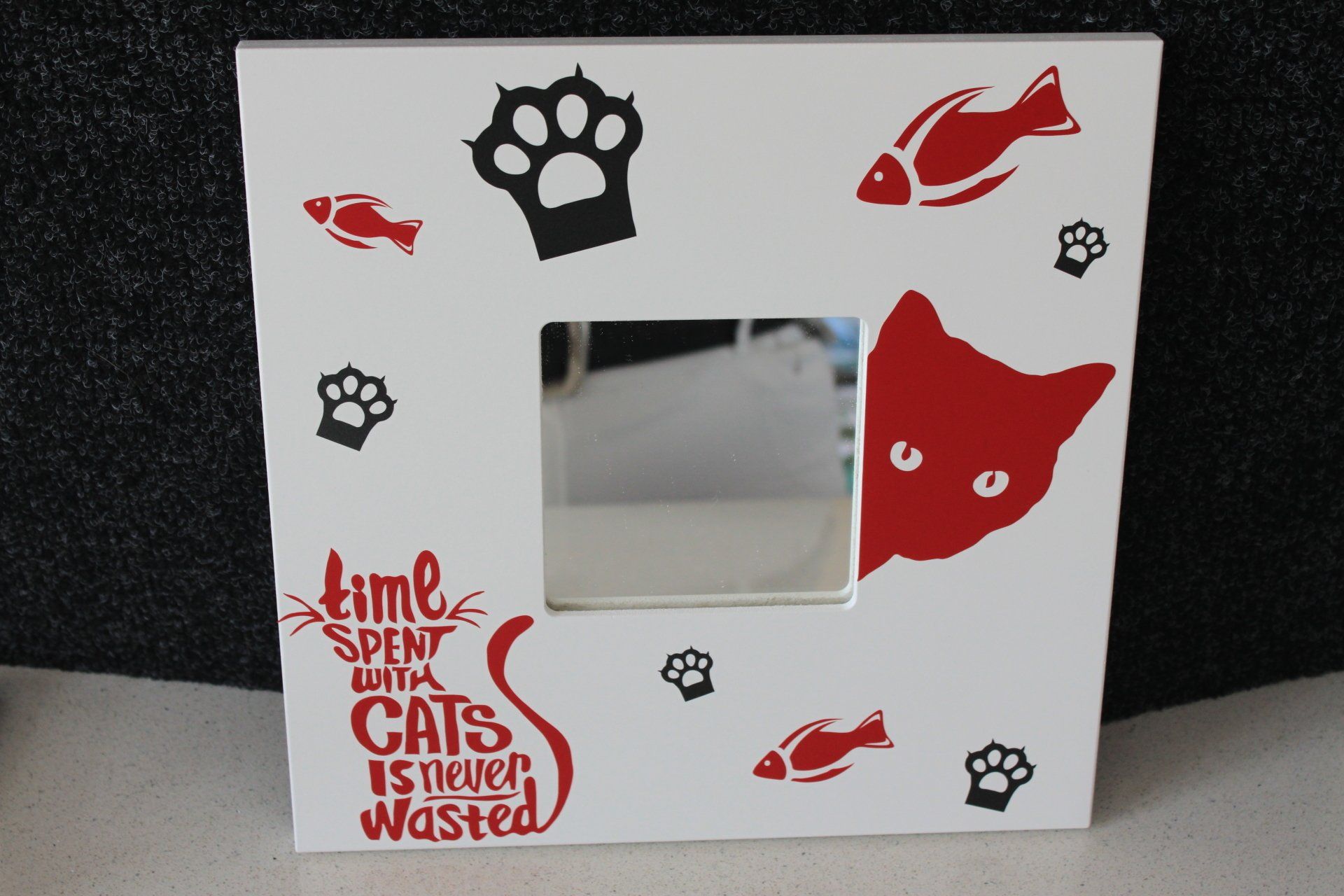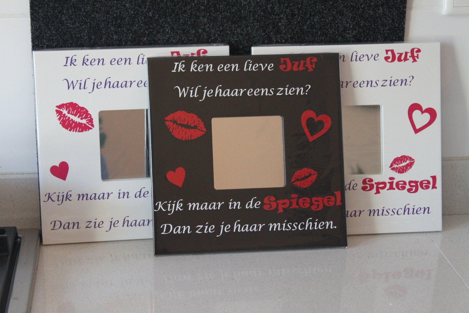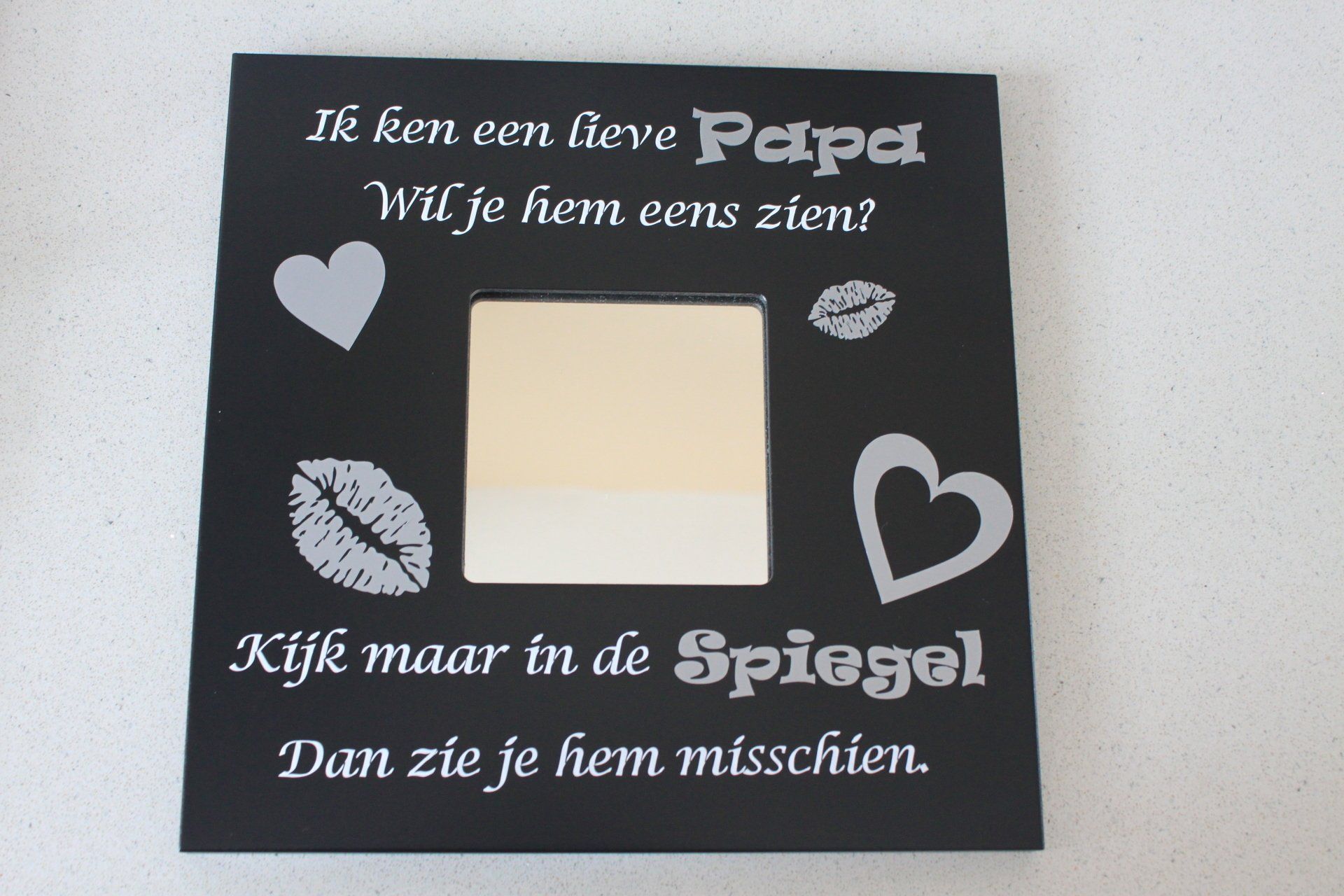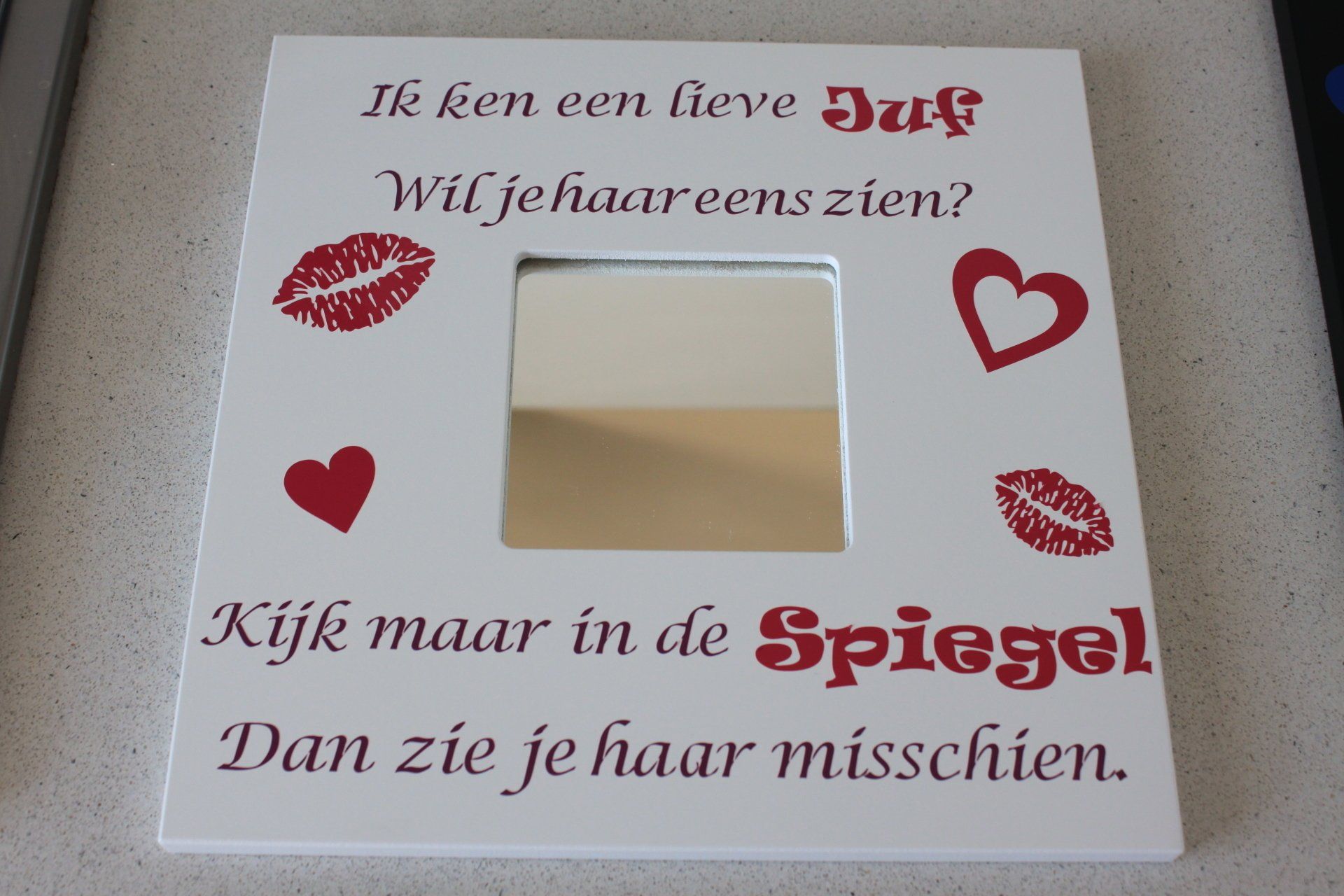 Een leuke cadeau voor hem of haar of wie dan ook. Leuke afbeelding of tekst op een spiegel(hoeft niet op spiegel kan overal op geplakt worden) en je hebt meteen de aandacht.